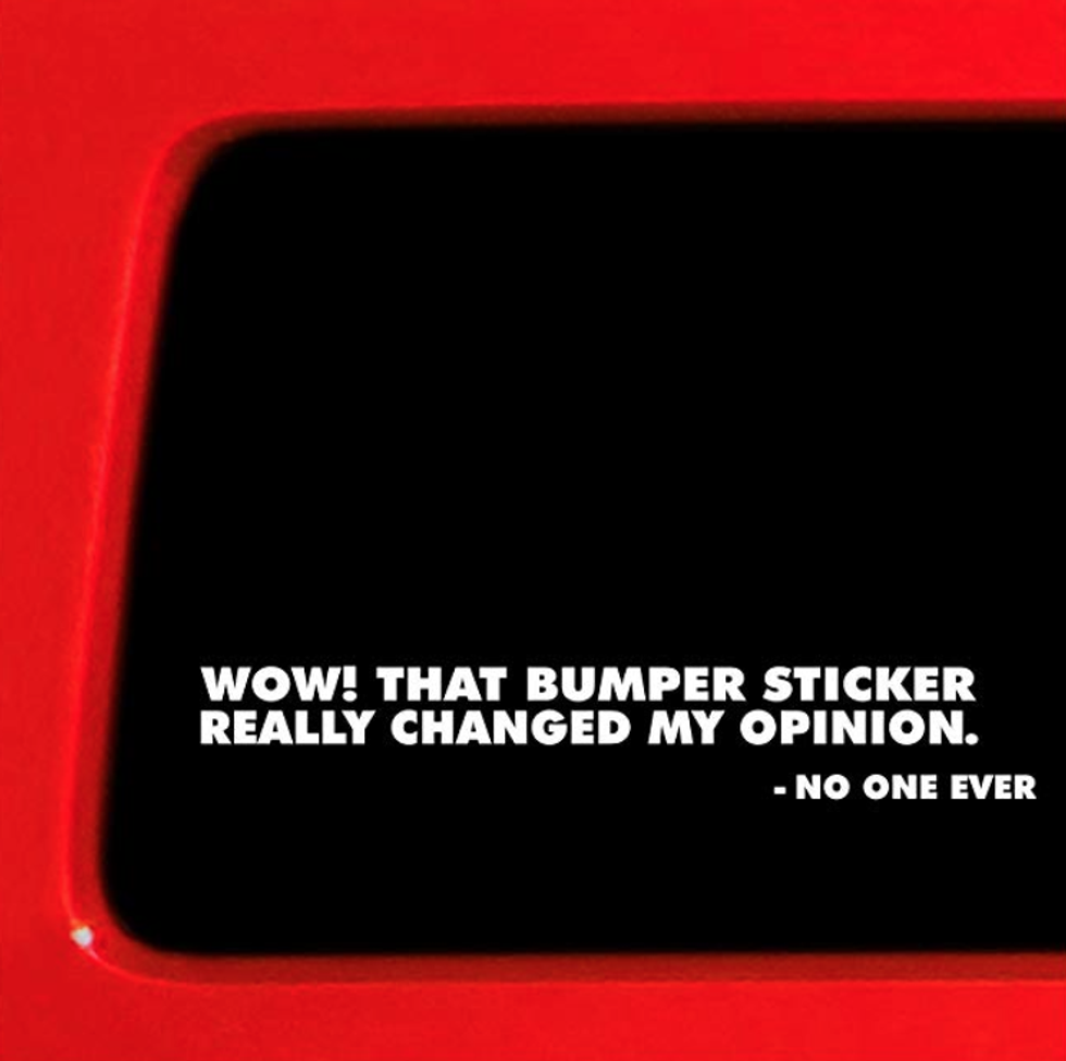 The best thing about social media is also the worst: These days everyone has a voice. Democracy is alive on the Internet but it's not always the same as making a statement. Before Twitter, millions of Americans shared their political and folksy wisdom through the analog power of the bumper sticker. Sure, sometimes those bumper stickers go a bit far or are in bad taste, but there's something delightful about the power of communicating pithy statements on the back of our cars.