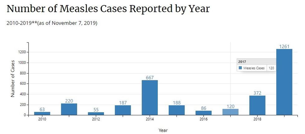 In fact, measles was thought to be eradicated in the US back in 2000 but there has been over 1200 cases in the U.S. this year.