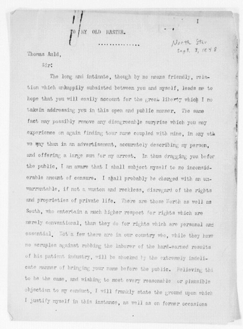 In 1848, on the tenth anniversary of his enslavement, he wrote a letter to his former master, Thomas Auld, that was published in his newspaper "The North Star."