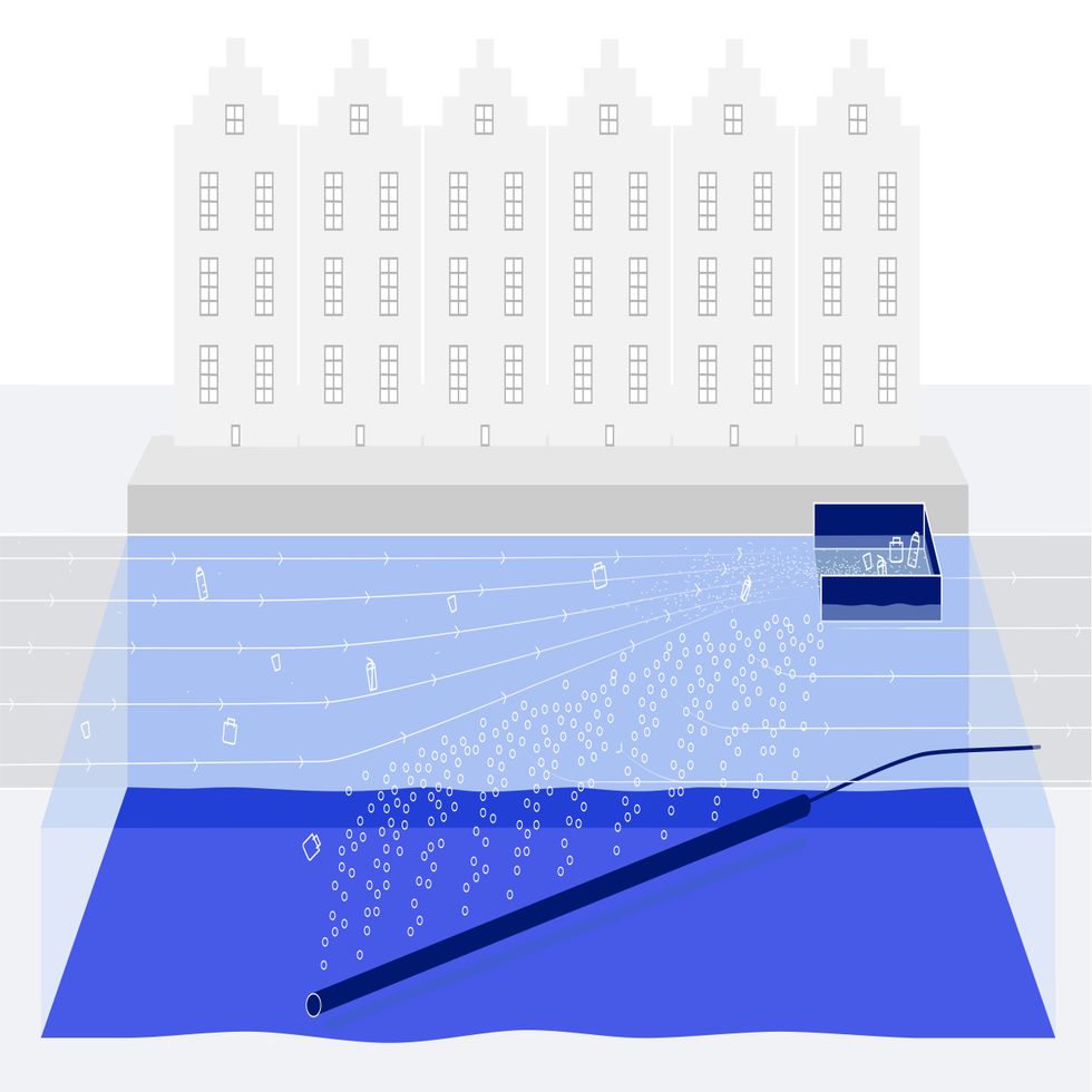 The barrier is a simple solution to a vexing problem. It's a long perforated tube placed diagonally at the bottom of a canal or river. Compressed air is pumped through the tube and rises upward through the holes. The air works with the natural current of the river to direct trash to one side of the waterway where it can be collected in a bin. Early tests have found that the bubble barrier blocks 86% of test materials.