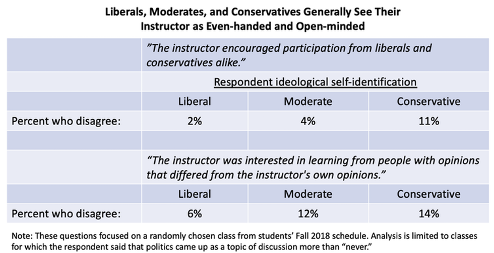 We asked students whether their course instructor "encouraged participation from liberals and conservatives alike." Only 2% of liberal students and 11% of conservatives disagreed that the instructor did so. Similarly, only 6% of liberals and 14% of conservatives disagreed that the same instructor "was interested in learning from people with opinions that differed from the instructor's own opinions."