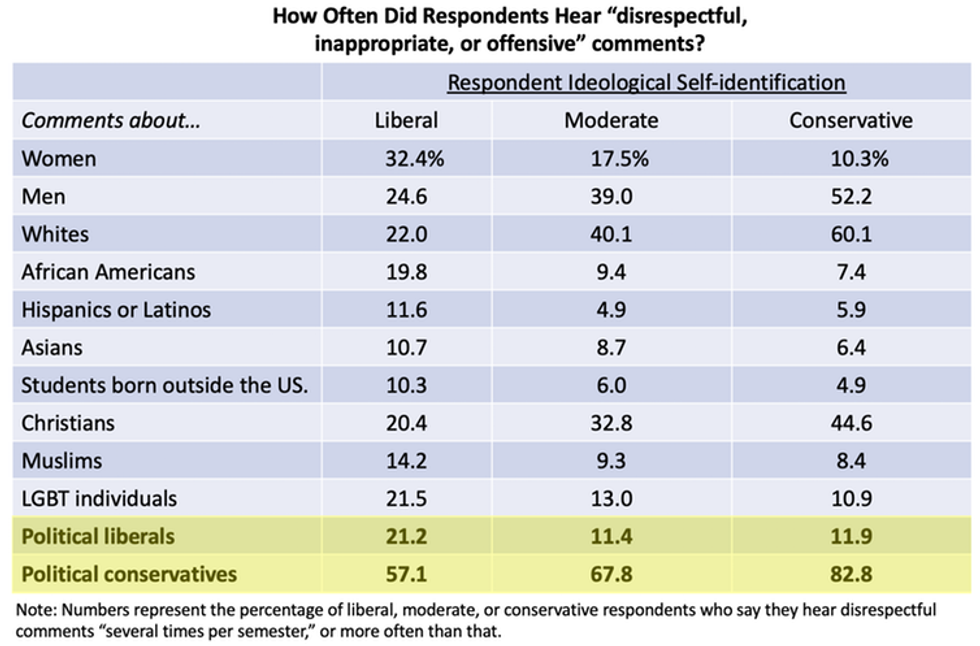 Pressures that disproportionately affect right-leaning students were evident outside the classroom as well. We asked how often students hear "disrespectful, inappropriate, or offensive comments" about 12 social groups on campus. Students – even those who identify as liberal – acknowledged hearing such comments directed at political conservatives far more often than at any other group.