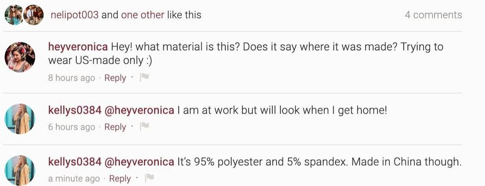 Freelance writer Robyn Pennacchia made this discovery after coming across screen shots of a potential buyer and someone selling an Alexo Athletica piece. When the vendor was asked about its materials, she responded: "It's 95 percent polyester and 5 percent spandex. Made in China though."