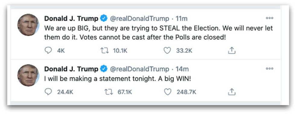With the battle over crucial electoral college votes still potentially days or even weeks away—and just after Democratic nominee Joe Biden spoke to the nation in a televised address to urge patience for official results—Trump, just before 1:00 am ET, tweeted he would be "making a statement tonight" and then called it "a big WIN!"