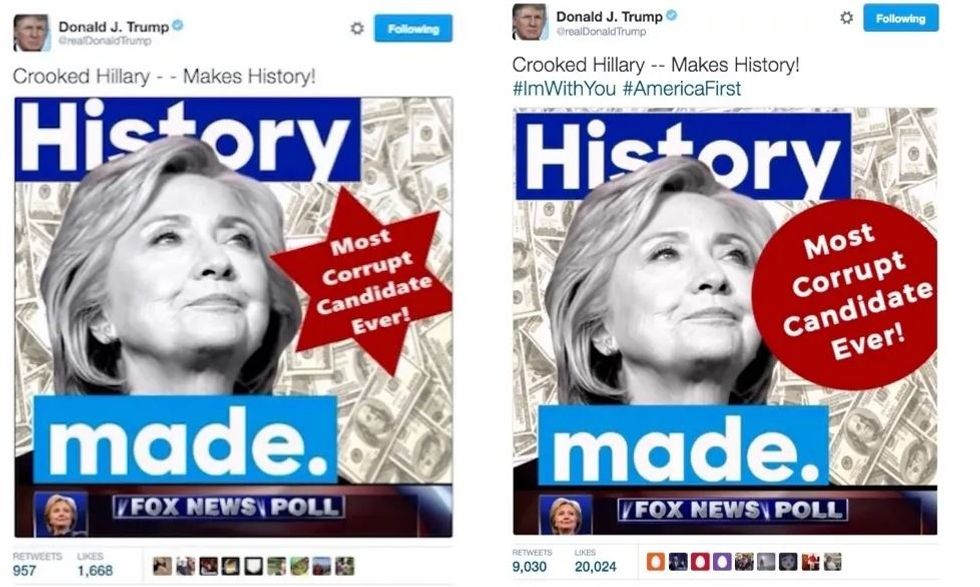 There was the tweet featuring Hillary Clinton with "Most Corrupt Candidate Ever" written in a Star of David. Trump deleted the original image and replaced the star with a circle. He would later claim the Star of David was a sheriff's badge.