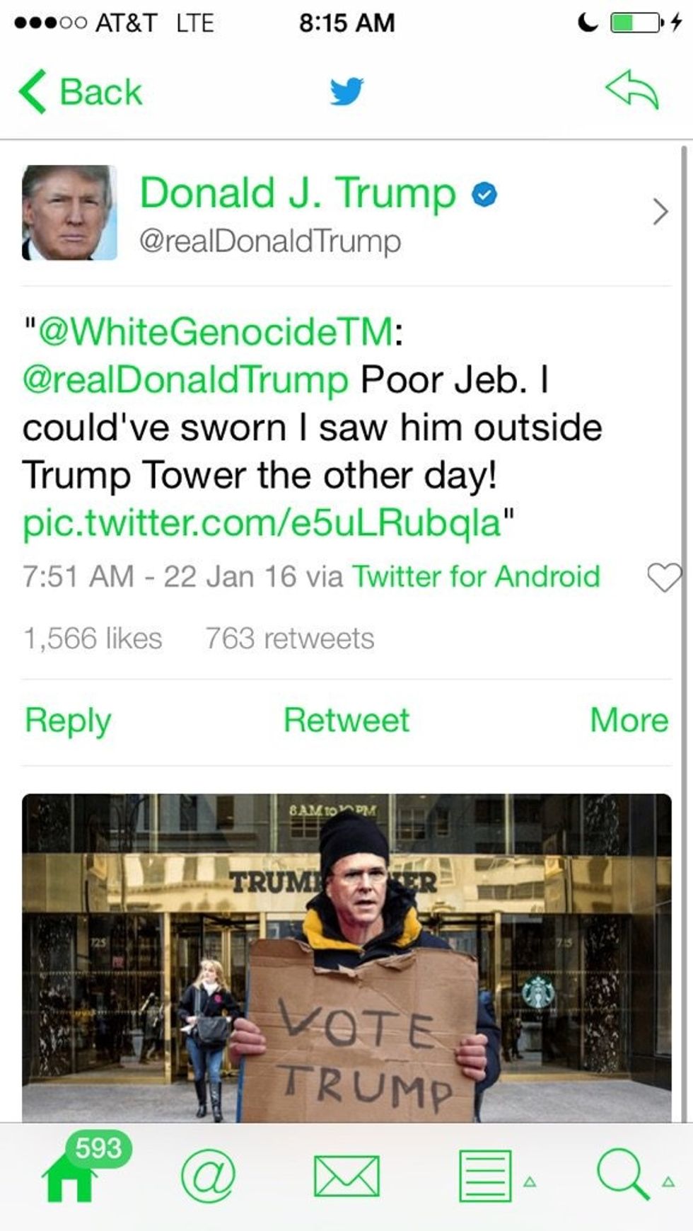 In 2016, he retweeted a tweet from a person with the handle @WhiteGenocideTM. The profile, which has since been suspended, used the name Donald Trumpovitz and linked to a website containing a pro-Adolf Hitler documentary. The profile also had the words "Get the F--- Out of My Country" written on the background photo, and featured a picture of George Lincoln Rockwell, founder of the American Nazi Party.
