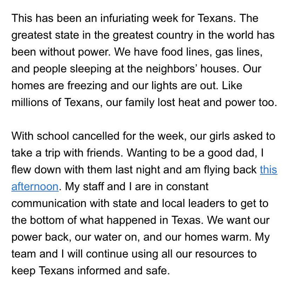 Cruz's decision to travel to a resort while his constituents are dealing with power outages, food shortages, frigid temperatures, and unplowed roads is unconscionable. This is a time for elected officials to step up and do their job, but Cruz decided it was best to bail when things got bad.