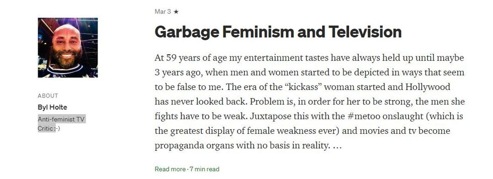 Byl has a Medium page where he calls himself an "anti-feminist TV critic."